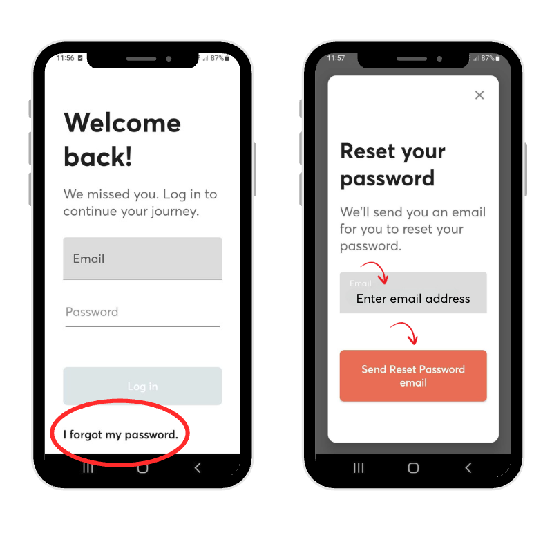 App: Tap App > select "Log In" > Tap "I forgot my password" > enter subscribed email address > Tap "Send Reset Password email".