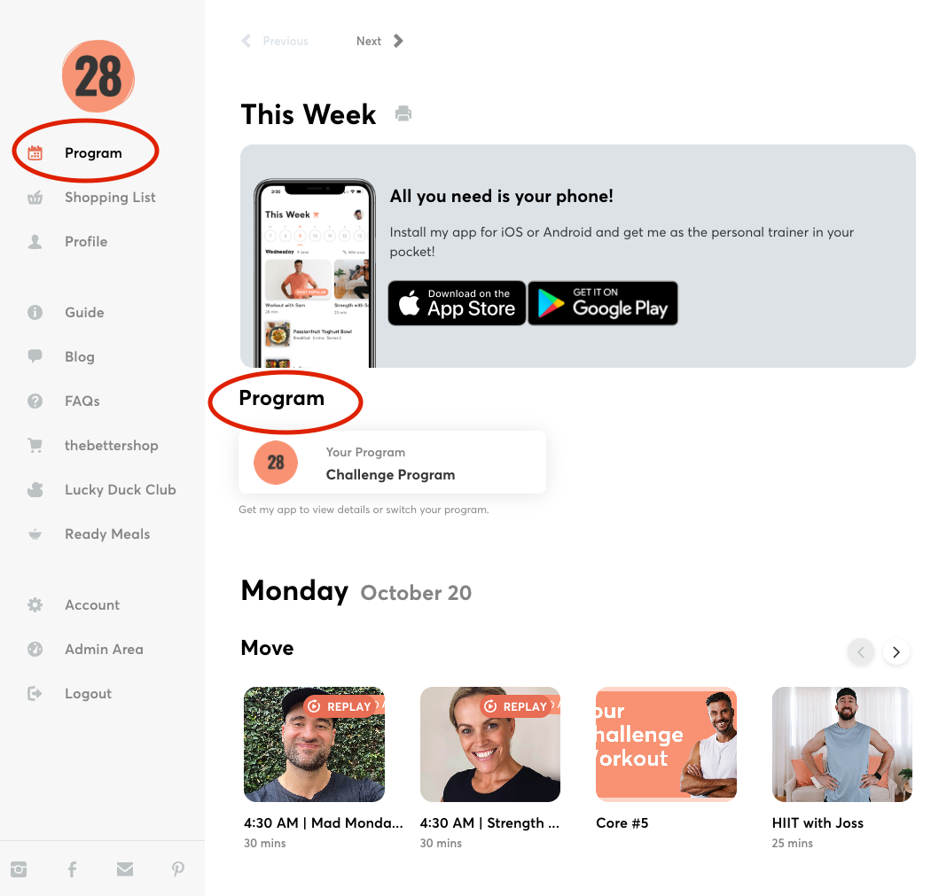 Simply head to the website and enter your login details. You’ll find your workout and meal plan for the day under ‘Program’ in the menu on the left hand side.