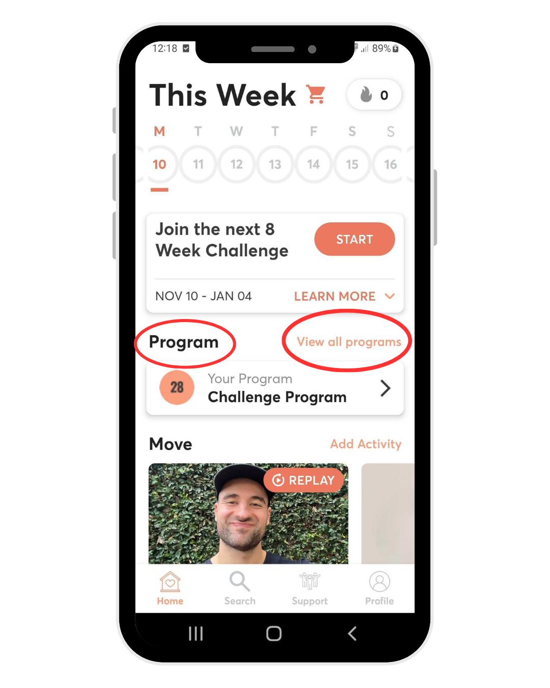 Once you have downloaded the app via the Apple App Store or the Google Play Store, enter your login details, you will access to your program via the home page.