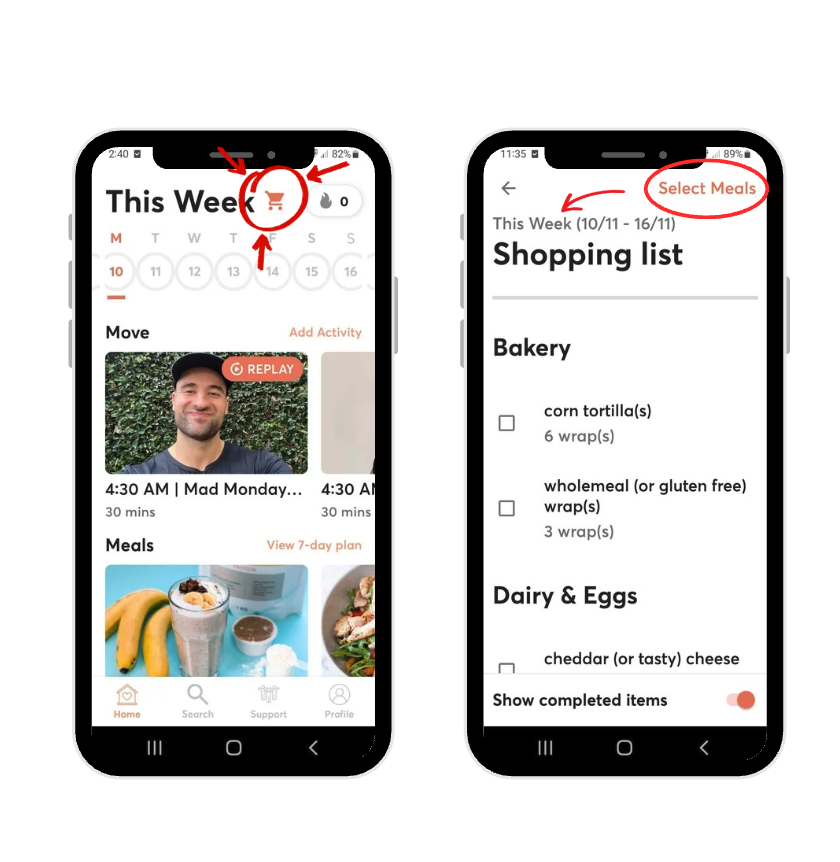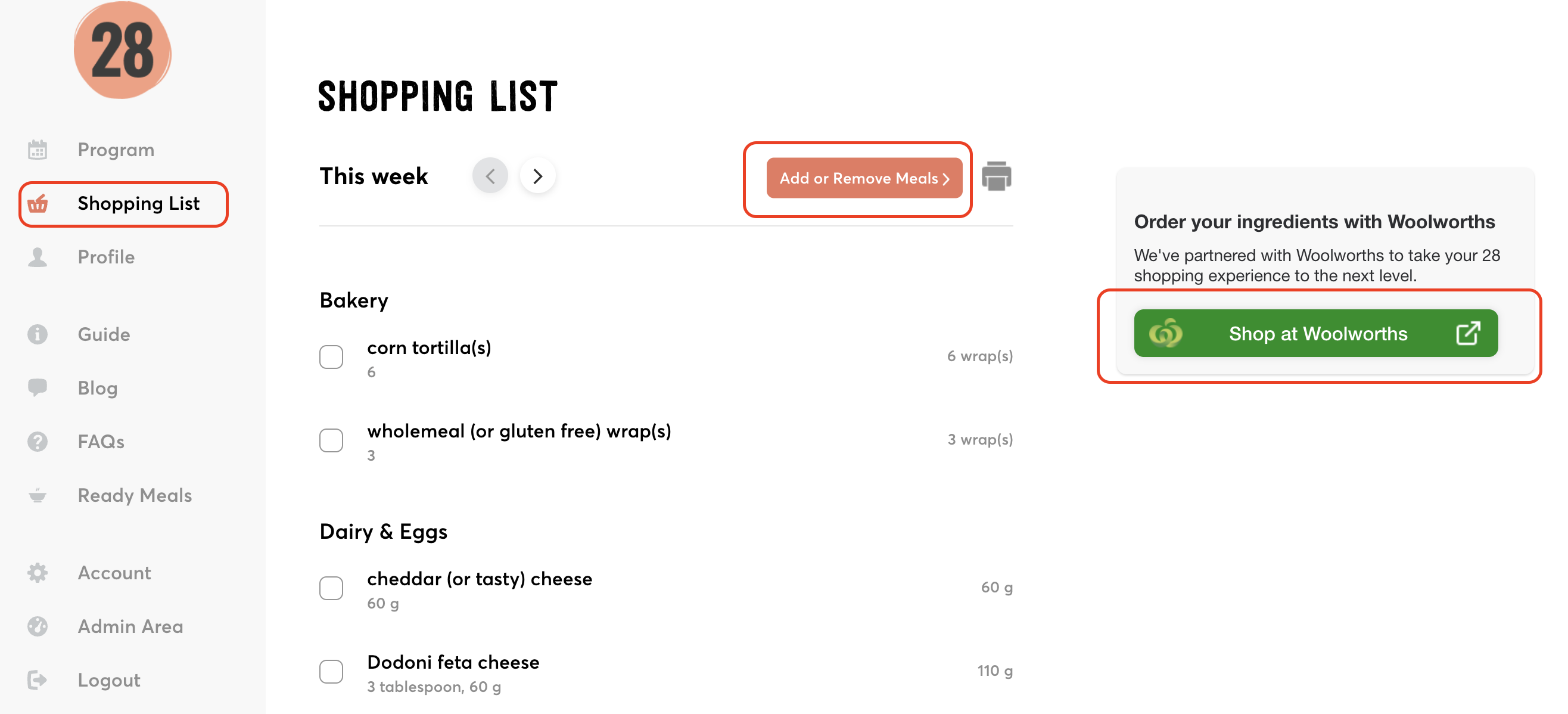 Your weeks food will pre-populate on your list. You can then cross of items you don't need, and remove meals if they are not needed—which will remove the ingredients from your shopping list.