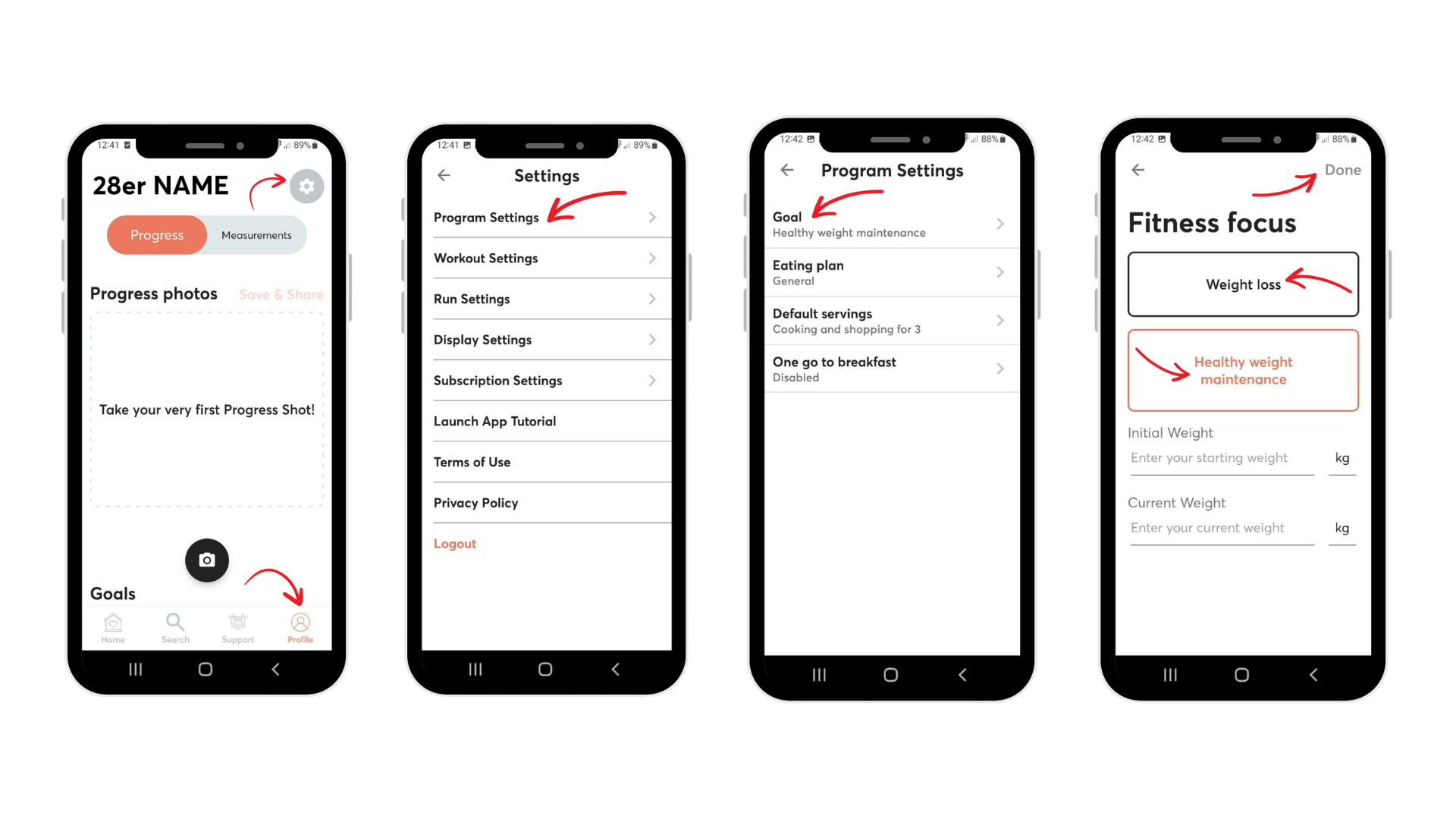 App: Head to “Profile" > "Settings" gear > "Program Settings " > "Goal" > Select "Weight Loss" or "Healthy weight maintenance" > tap to "Done" .