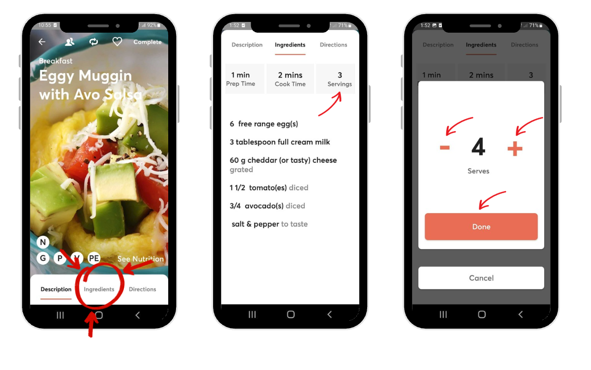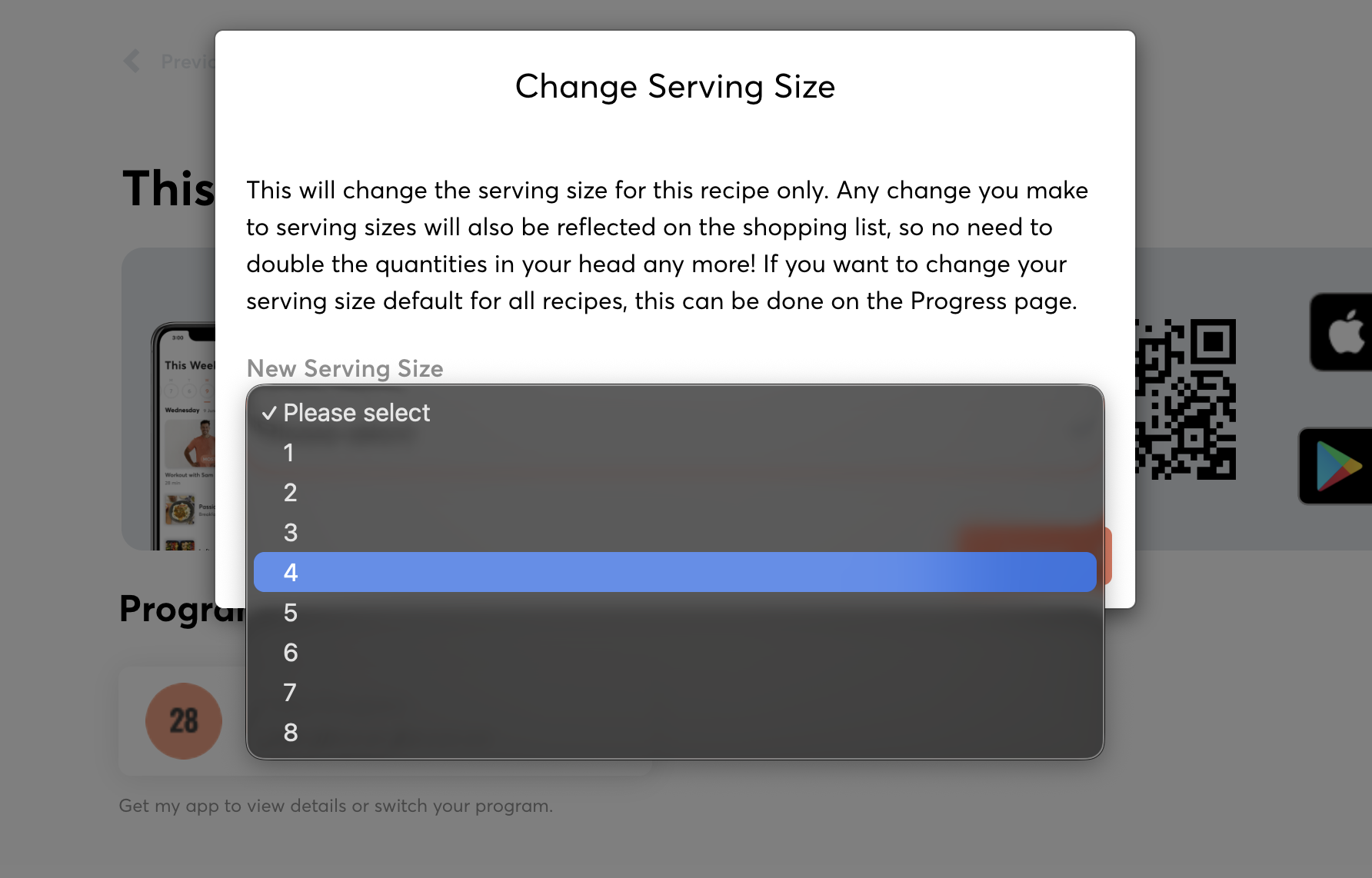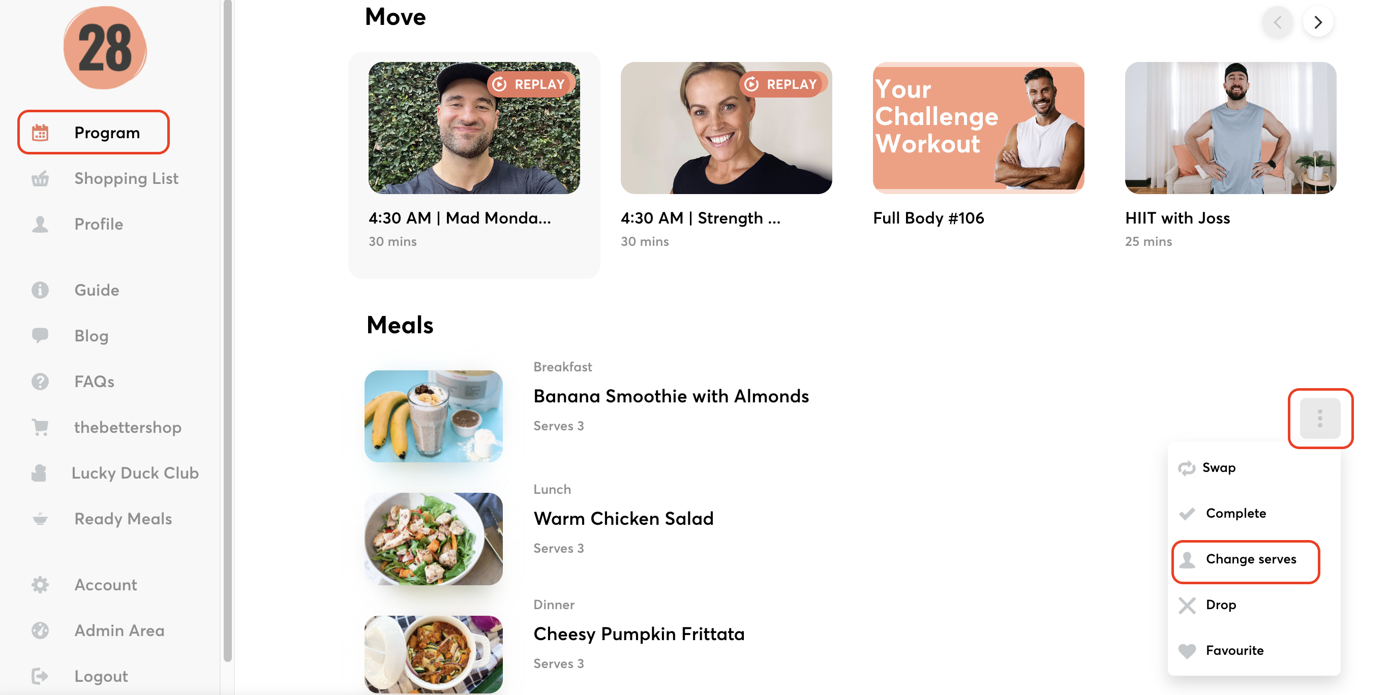 - Head to the main program page and click on the 3 dots to the right of a recipe. This will bring up a menu and you can click on the ‘change serves’ option. Select new serve amount from drop down box and press submit.