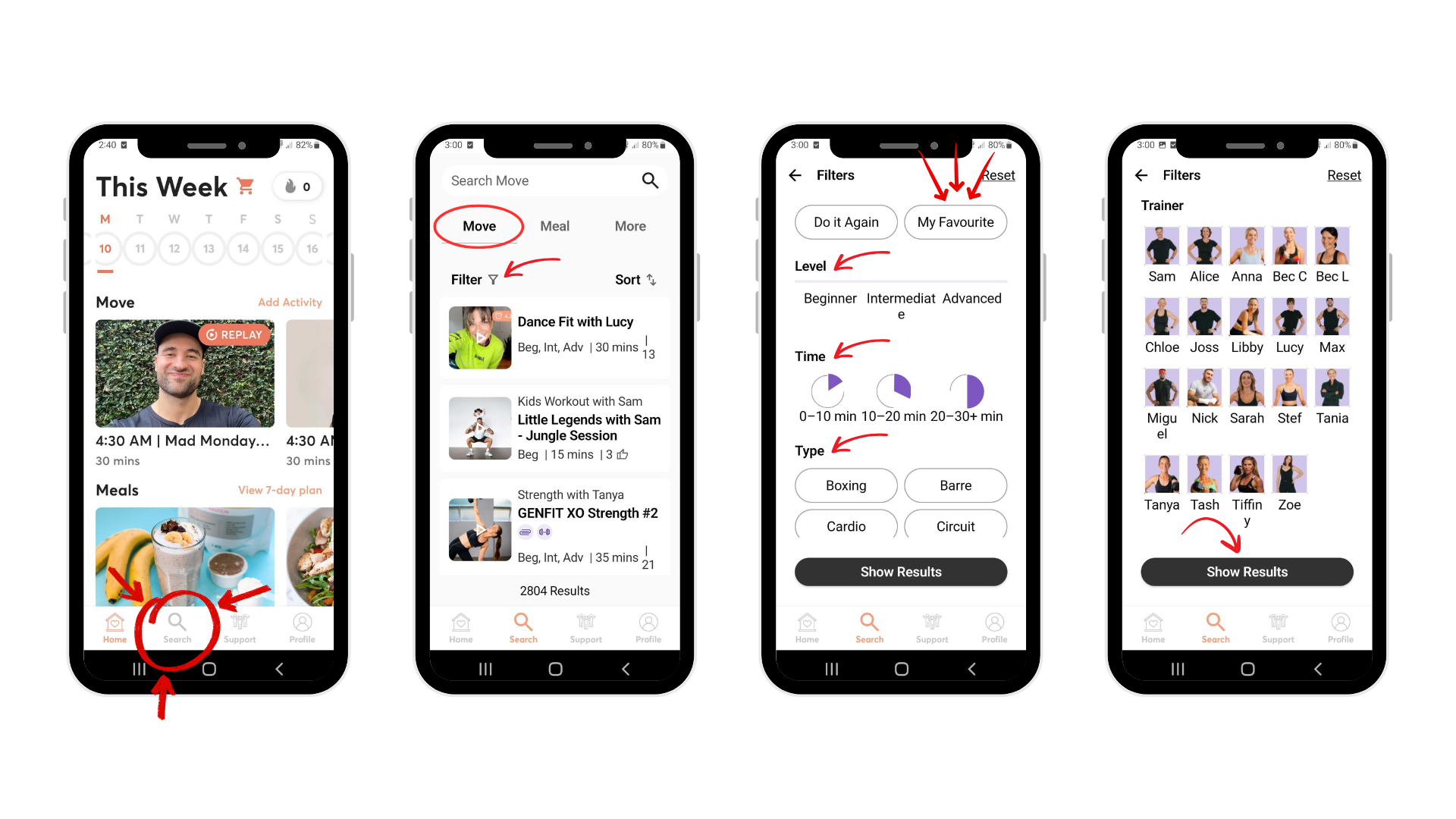 Head to “Search” in the app from the home page. Select Move > Filter. Then you can select from the sub headings to suit what you are looking for that day for your movement.