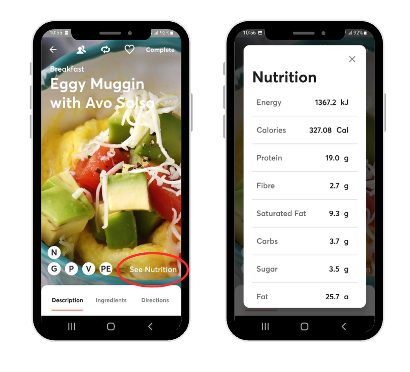 'See Nutrition' (i) icon when in the recipe. The information shown is based on one serving and will automatically adjust according to your goal and selected gender.
