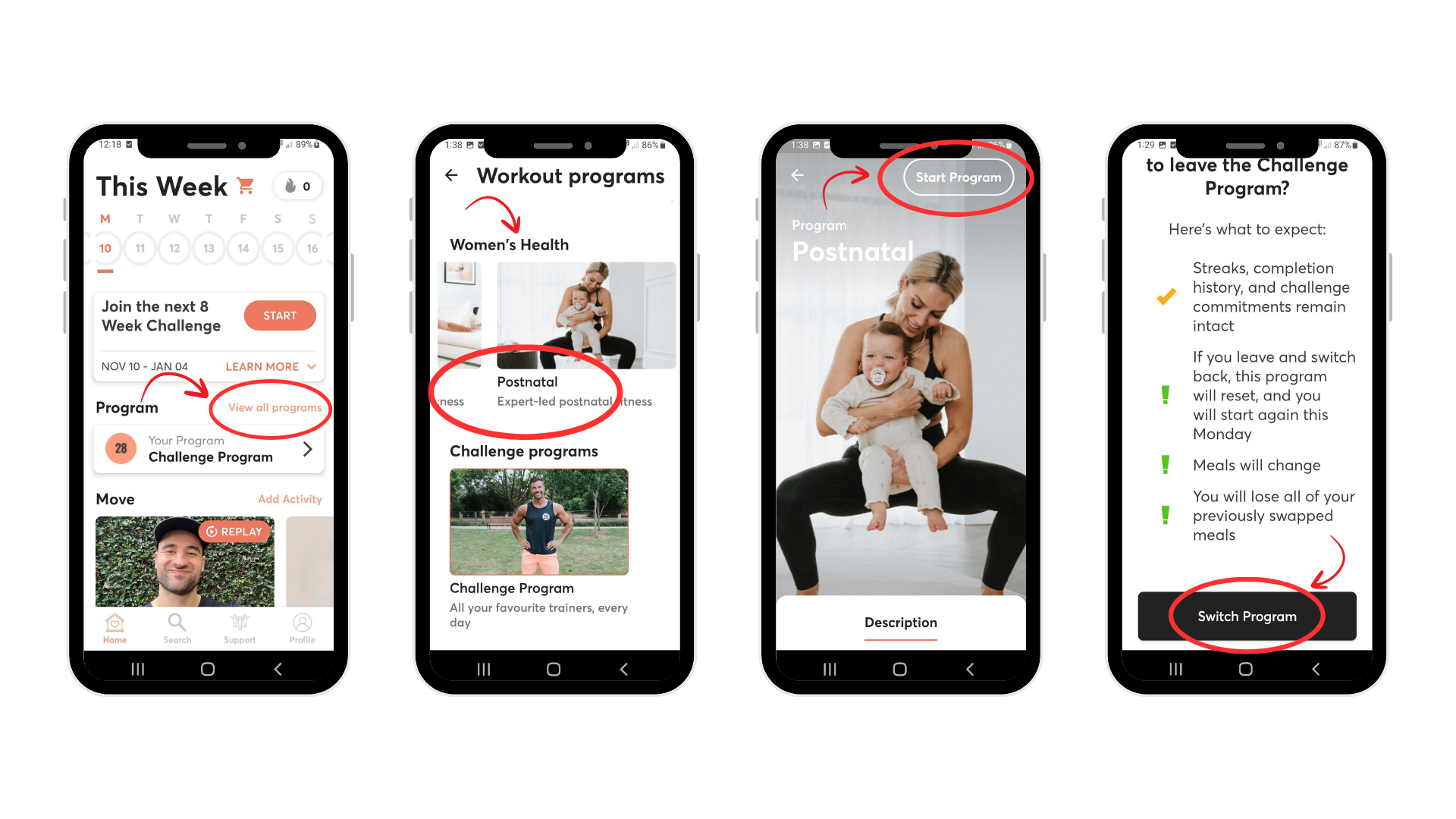 To change into our Postnatal program, please access the program via the app, click 'View all programs' > scroll to select our Postnatal program > click Start Program and click Switch Program.