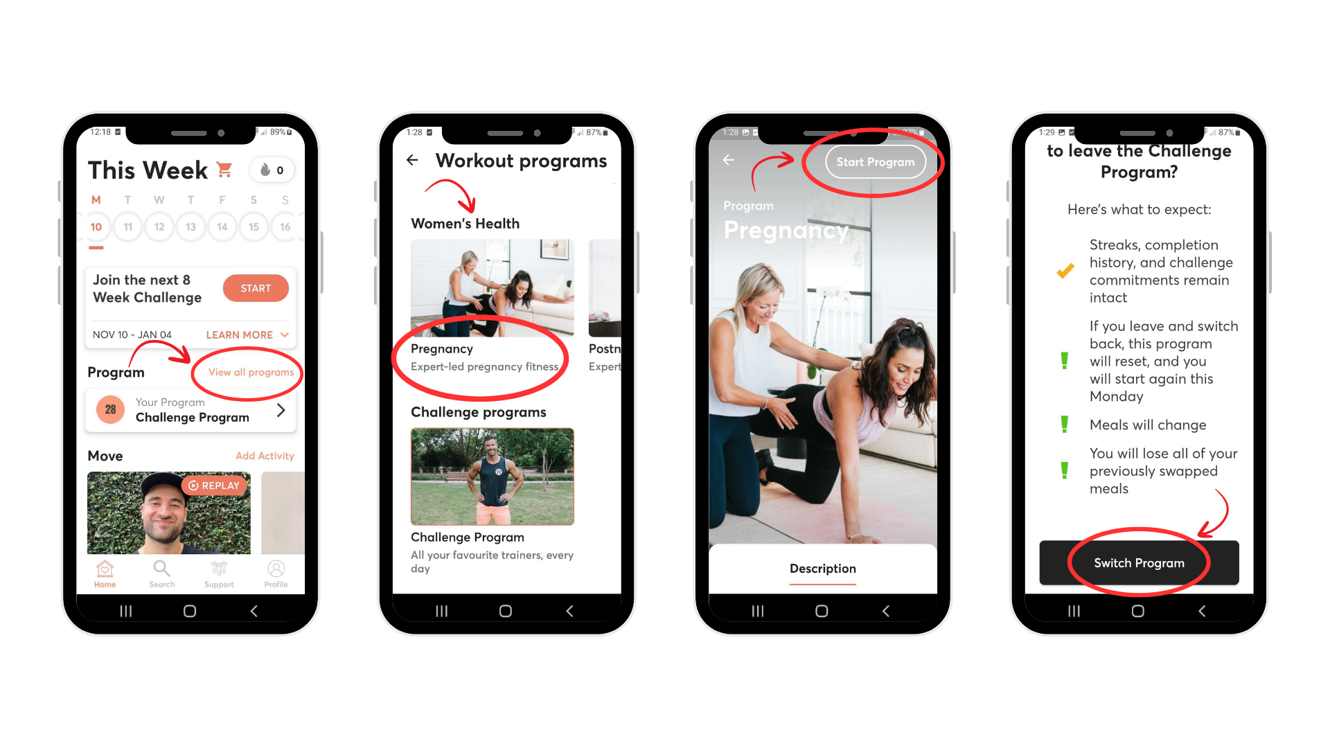 To select the pregnancy program, please access the program via the app, click 'View all programs' > scroll to select our Pregnancy program and click Start Program > Select Switch Program > enter in your due date and click done.