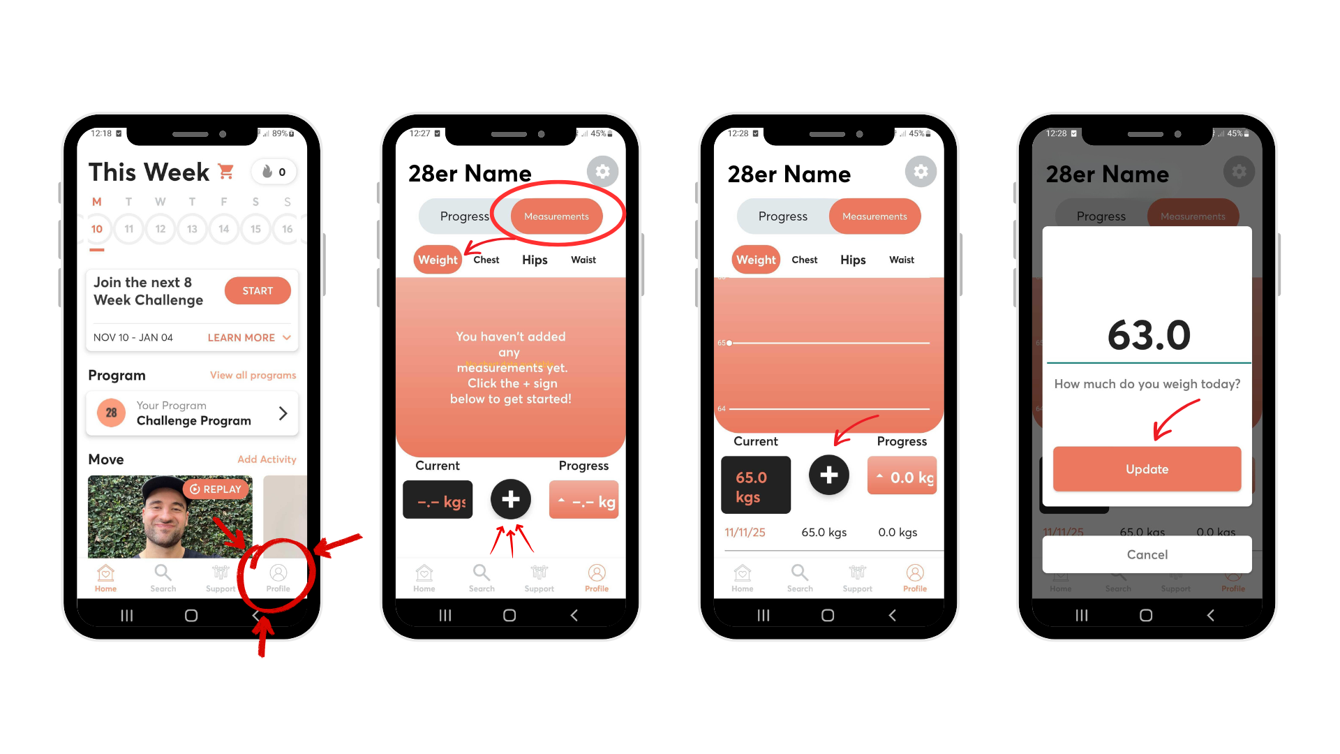 To update your weight and/measurements, head to Profile > Measurements > Weight or Chest or Hips or Waist > Tap on the white plus in the black circle > Enter days weight/measurement > Select done.