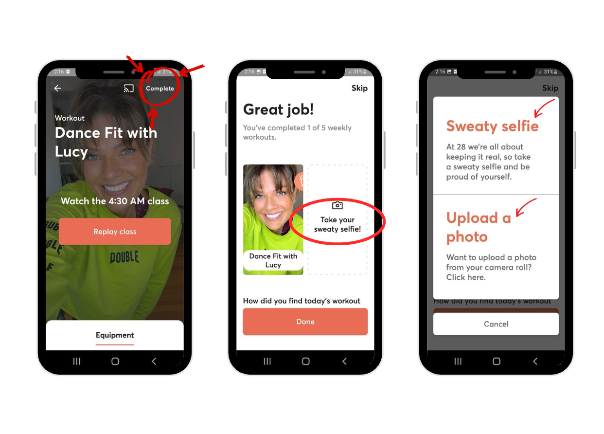 Once you have completed a workout, you will be invited to take your post workout sweaty selfie to share with the community, or you can just keep it for your private record.